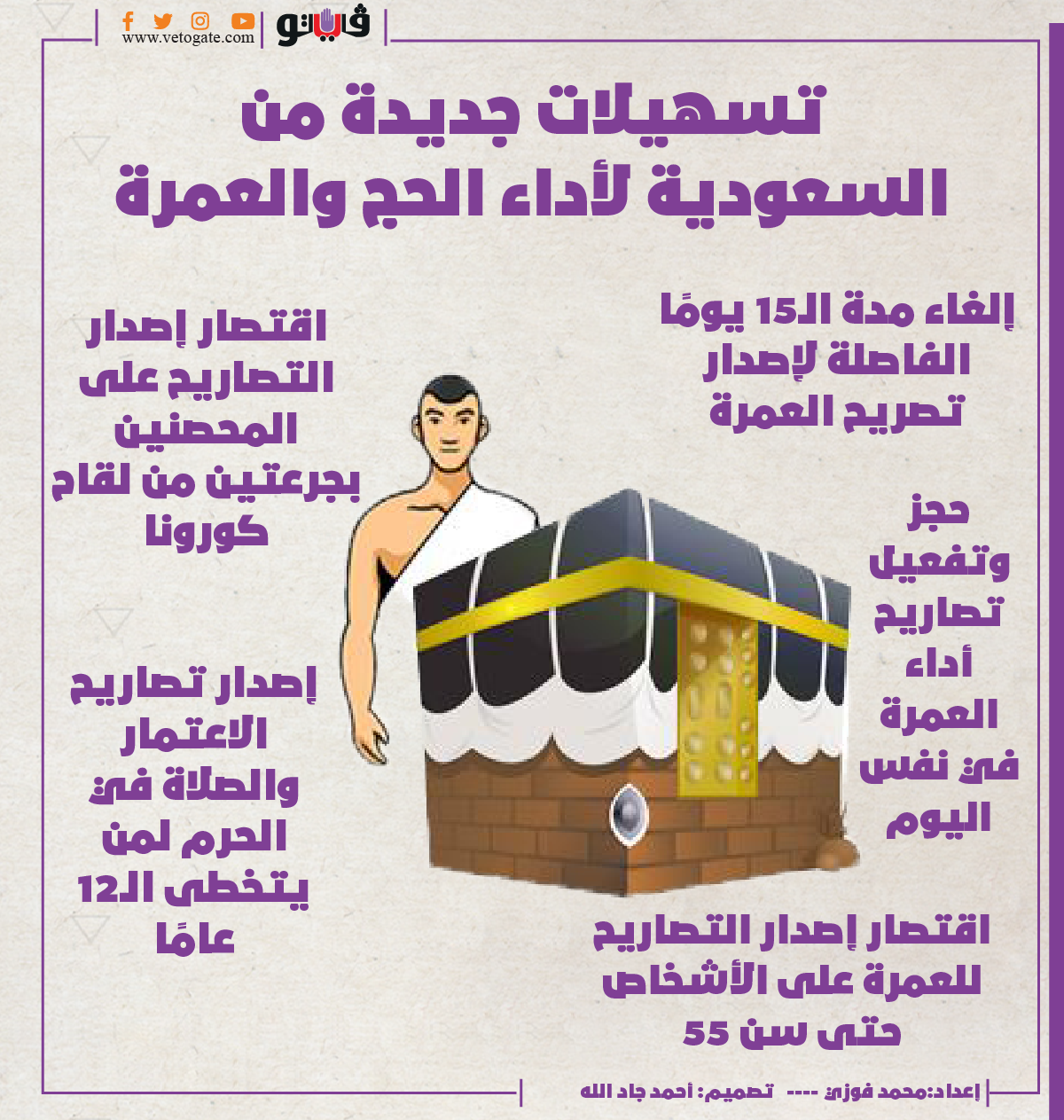 تسهيلات جديدة من السعودية لأداء الحج والعمرة | إنفوجراف الإثنين 25/أكتوبر/2021 - 07:22 م 10/25/2021 7:22:09 PM الحرم المكي شارك طباعة 18 حجم الخط شارك طباعة السعودية الحج العمرة الحرم المكي تصريح العمرة لقاح كورونا