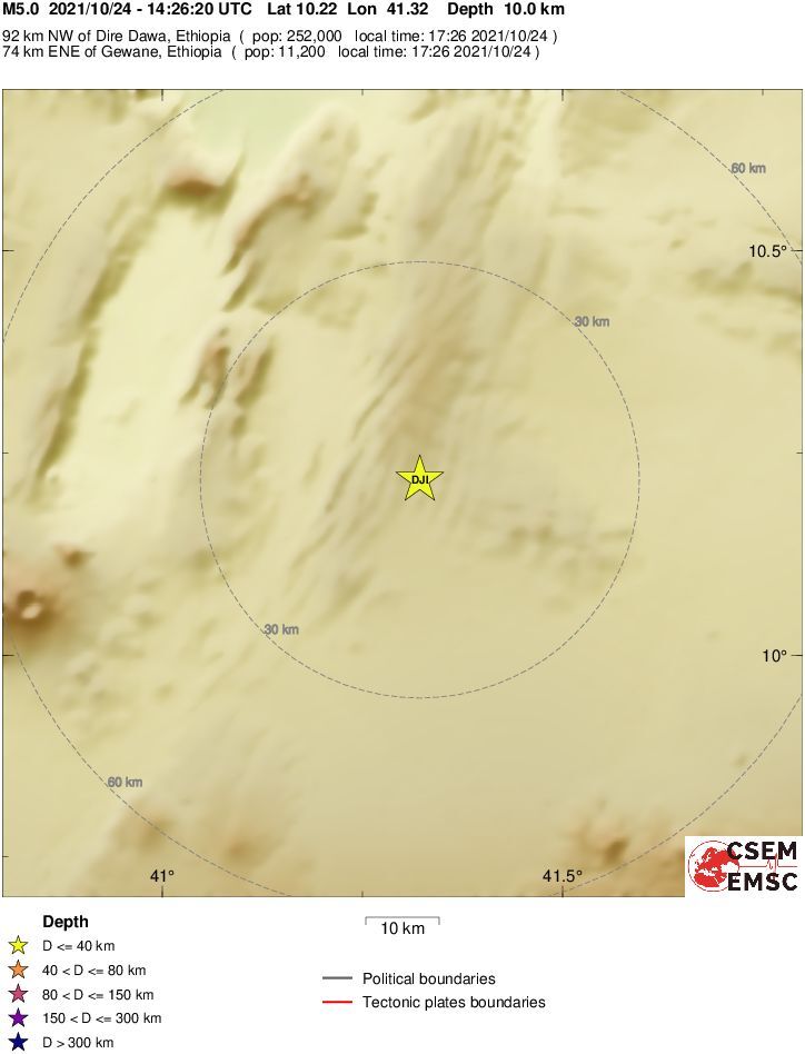 ضرب زلزال بقوة 5 درجات على مقياس ريختر إثيوبيا بحسب بيان المركز الأورومتوسطي لرصد الزلازل.