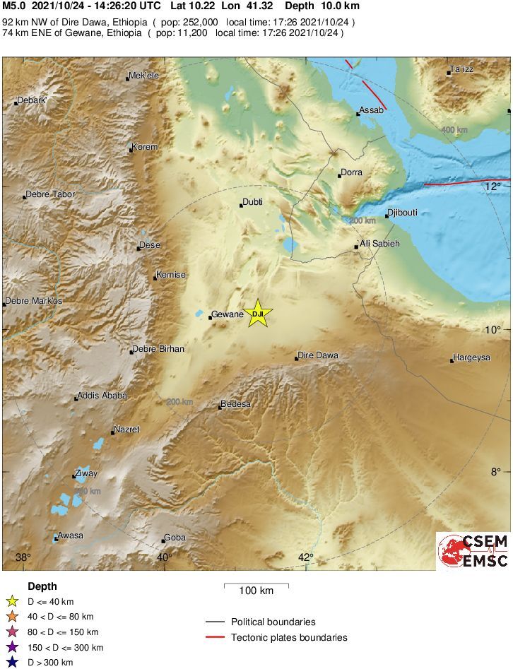 وذكر المركز الأورومتوسطي لرصد الزلازل أن هزة أرضية بقوة 5 درجات على مقياس ريشتر ضرب إثيوبيا اليوم الأحد.