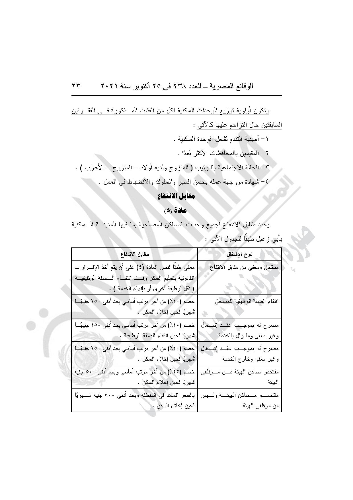 نشرت جريدة الوقائع المصرية في عددها رقم 238، الصادر في 25 أكتوبر 2021، قرار وزارة النقل رقم 524 لسنة 2021، بإصدار لائحة الانتفاع بوحدات المساكن المصلحية المملوكة للهيئة القومية لسكك حديد مصر.
