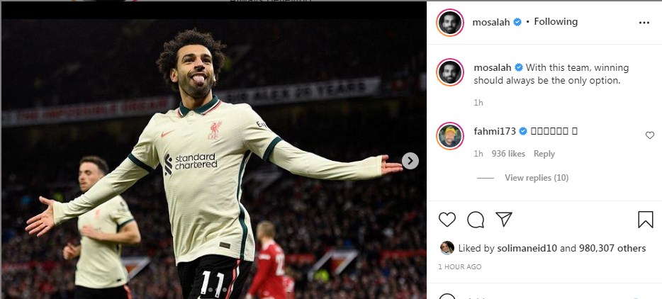 وكتب محمد صلاح على إنستجرام قائلًا: "مع هذا الفريق، الفوز يجب أن يكون خيارك الوحيد دائمًا".