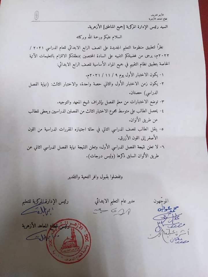 أعلن قطاع المعاهد الأزهرية عن طريقة تقييم طلاب الصف الرابع الإبتدائي، وذلك في إطار تطبيق المنظومة التعليمية الجديدة التي يطبقها الأزهر الشريف للعام الدراسي 2021 - 2022، وذلك على النحو التالي: