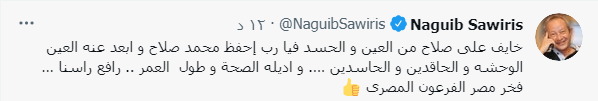 وكتب ساويرس، عبر حسابه الرسمي على موقع التدوينات القصيرة "تويتر": "خايف على صلاح من العين والحسد فيا رب احفظ محمد صلاح وابعد عنه العين الوحشة والحاقدين والحاسدين.. واديله الصحة وطول العمر.. رافع راسنا.. فخر مصر الفرعون المصري".