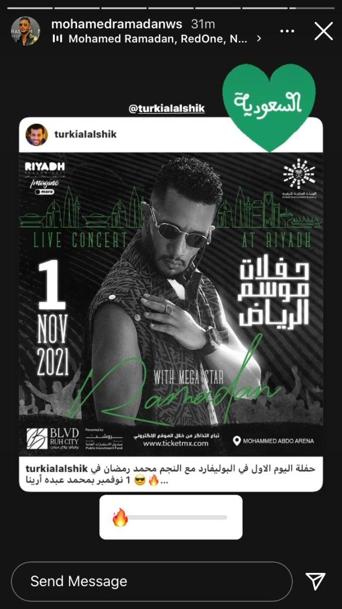 من جهته، قام محمد رمضان بمشاركته منشور تركي آل الشيخ الخاص بحفله عبر ستوري حسابه على موقع تبادل الصور والفيديوهات “إنستجرام”.