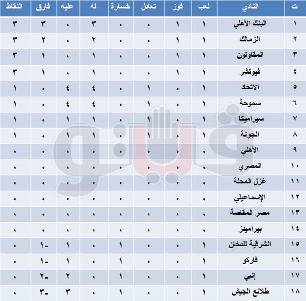 ويحتل البنك الأهلي صدارة جدول ترتيب الدوري الممتاز بفارق الأهداف عن الزمالك والمقاولون العرب وفيوتشر ولكل منهما ثلاث نقاط.