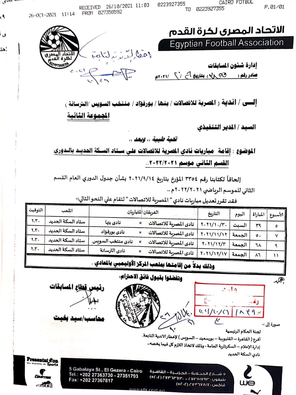 وأخطر اتحاد الكرة أندية بنها وبورفؤاد ومنتخب السويس والترسانة بإقامة مباريات الاتصالات بملعب السكة الحديد.