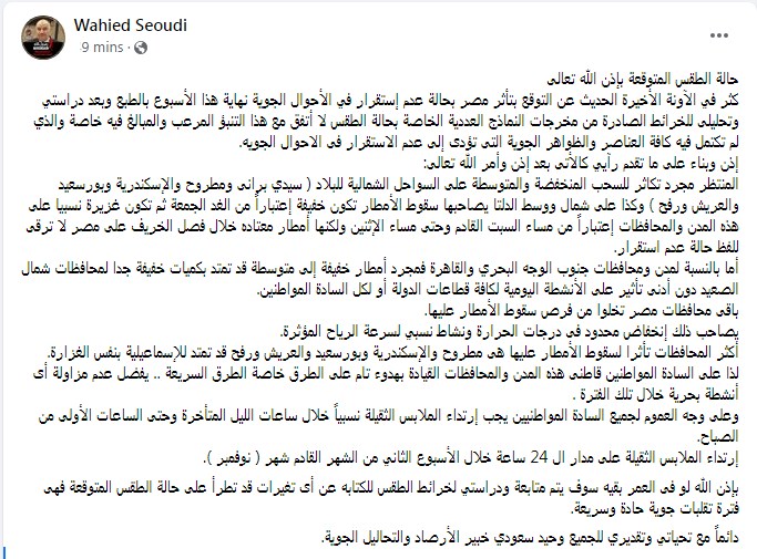 وكتب وحيد سعودي تدوينة على الفيس بوك قال فيها: "كثر في الآونة الأخيرة الحديث عن التوقع بتأثر مصر بحالة عدم استقرار في الأحوال الجوية نهاية هذا الأسبوع، وبعد دراستي وتحليلي للخرائط الصادرة من مخرجات النماذج العددية الخاصة بحالة الطقس لا أتفق مع هذا التنبؤ المرعب والمبالغ فيه خاصة والذي لم تكتمل فيه كافة العناصر والظواهر الجوية التى تؤدى إلى عدم الاستقرار فى الأحوال الجويه".