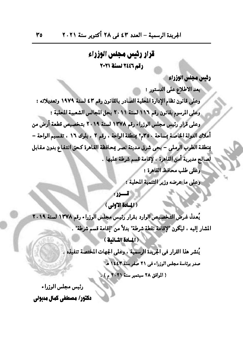 والقرار رقم 2446 لسنة 2021، بتعديل غرض التخصيص الوارد بقرار رئيس الوزراء رقم 1378 لسنة 2019، ليكون "لإقامة نقطة شرطة" بدلًا من "إقامة قسم شرطة".