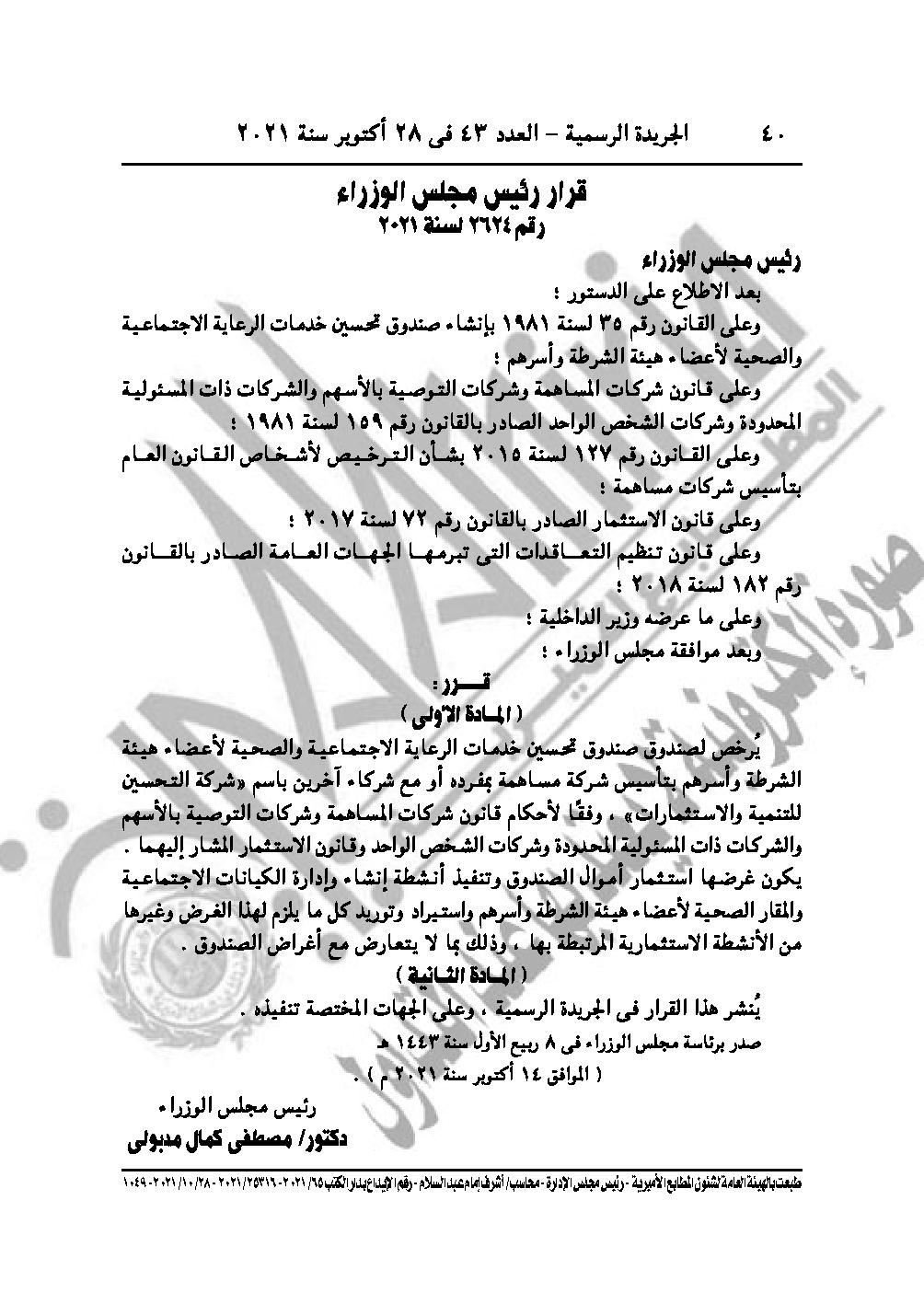 والقرار رقم 2624 لسنة 2021 بالترخيص لصندوق صندوق تحسين خدمات الرعاية الاجتماعية والصحية لأعضاء هيئة الشرطة وأسرهم بتأسيس شركة مساهمة بمفرده أو مع شركاء آخرين باسم "شركة التحسين للتنمية والاستثمار".