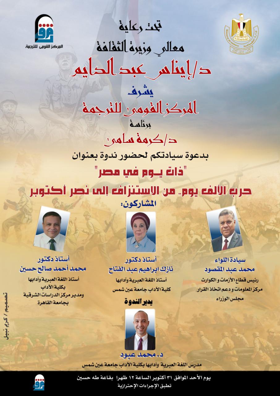 ينظم المركز القومي للترجمة برئاسة الدكتورة كرمة سامي ندوة بعنوان "ذات يوم في مصر: حرب الألف يوم من الاستنزاف الى نصر أكتوبر " وذلك في الساعة ١٢ ظهرًا يوم الأحد المقبل الموافق ٣١ أكتوبر ٢٠٢١ بقاعة طه حسين بمقر المركز القومي للترجمة.