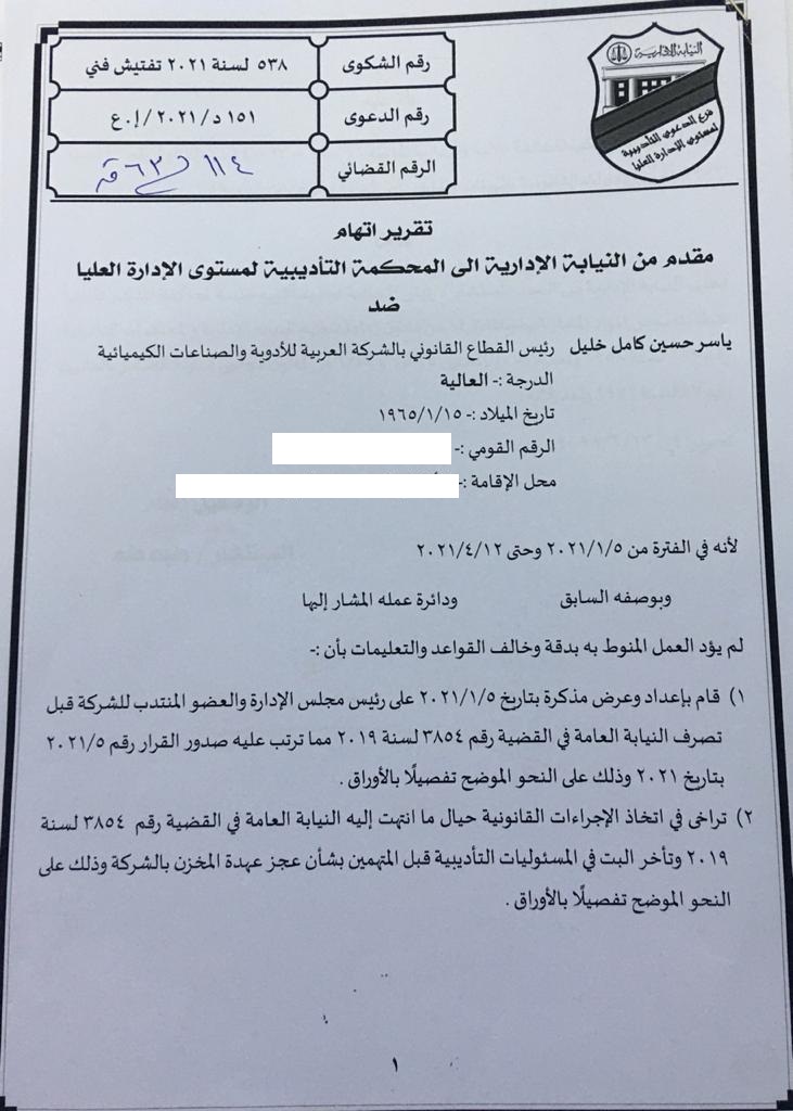وأكد تقرير الإتهام أن ياسر حسين كامل، رئيس القطاع القانوني بالشركة العربية للأدوية والصناعات الكيماوية، بدرجة "وكيل وزارة"، إرتكب المخالفة المالية والإدارية المنصوص عليها في المواد أرقام 21 و22 و23 و24، من القانون رقم 47 لسنة 1973 بشأن الإدارات القانونية بالهيئات والمؤسسات العامة والوحدات التابعة لها، ولم يؤد العمل المنوط به بدقة وخالف القواعد والتعليمات.
