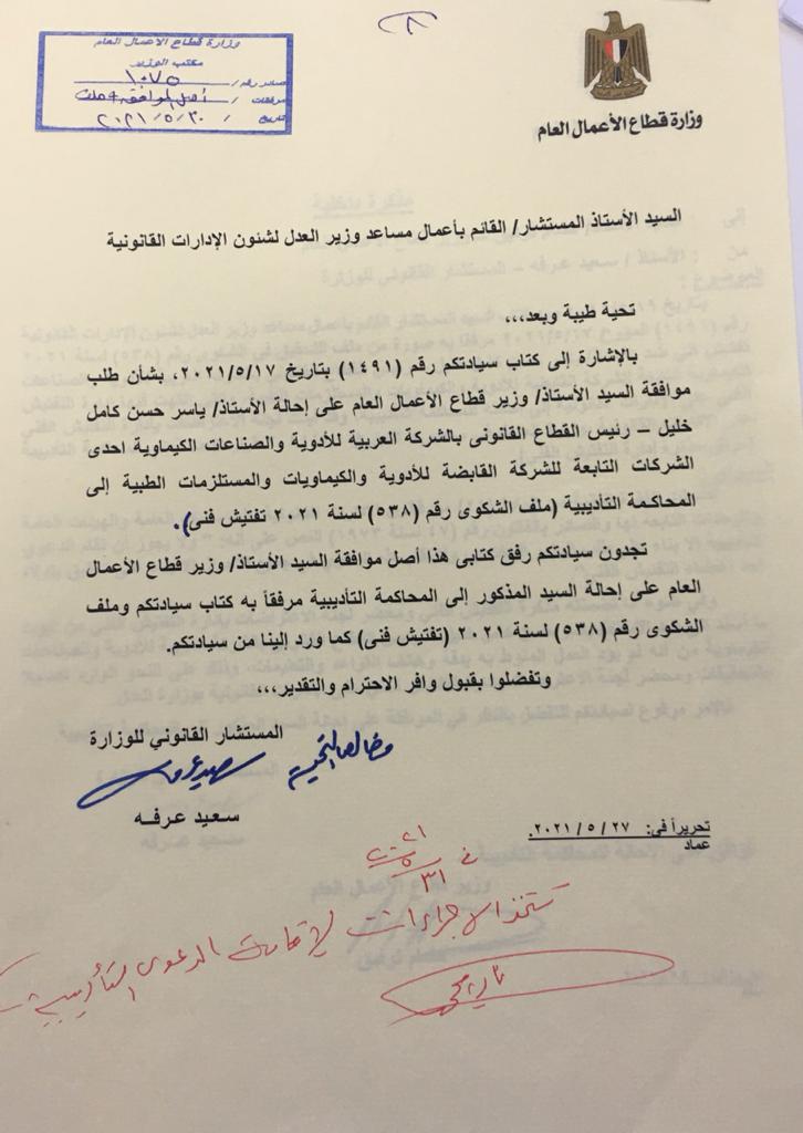 قررت إدارة التفتيش الفني على الإدارات القانونية بوزارة العدل في القضية رقم 114لسنة 63 قضائية عليا إحالة رئيس القطاع القانوني بالشركة العربية للأدوية والصناعات الكيماوية للمحاكمة التأديبية العاجلة بعد ثبوت ارتكابه مخالفات مالية وإدارية وقانونية جسيمة.