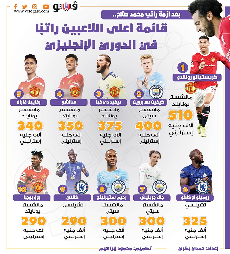 بعد أزمة راتب محمد صلاح.. قائمة أعلى اللاعبين راتبًا في الدوري الإنجليزي | إنفوجراف