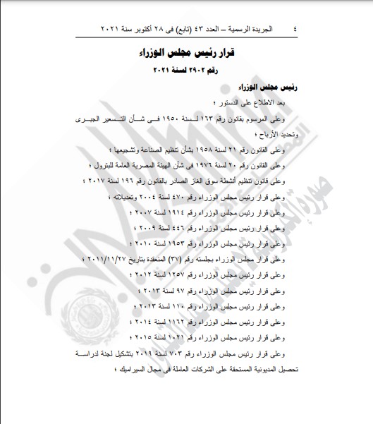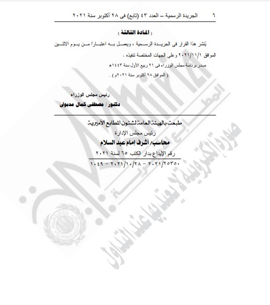 وجاء قرار رئيس مجلس الوزراء المنشور في الجریدة الرسمیة – العدد ٤٣ فى ٢٨ أكتوبر سنة ٢٠٢١ كالتالي: