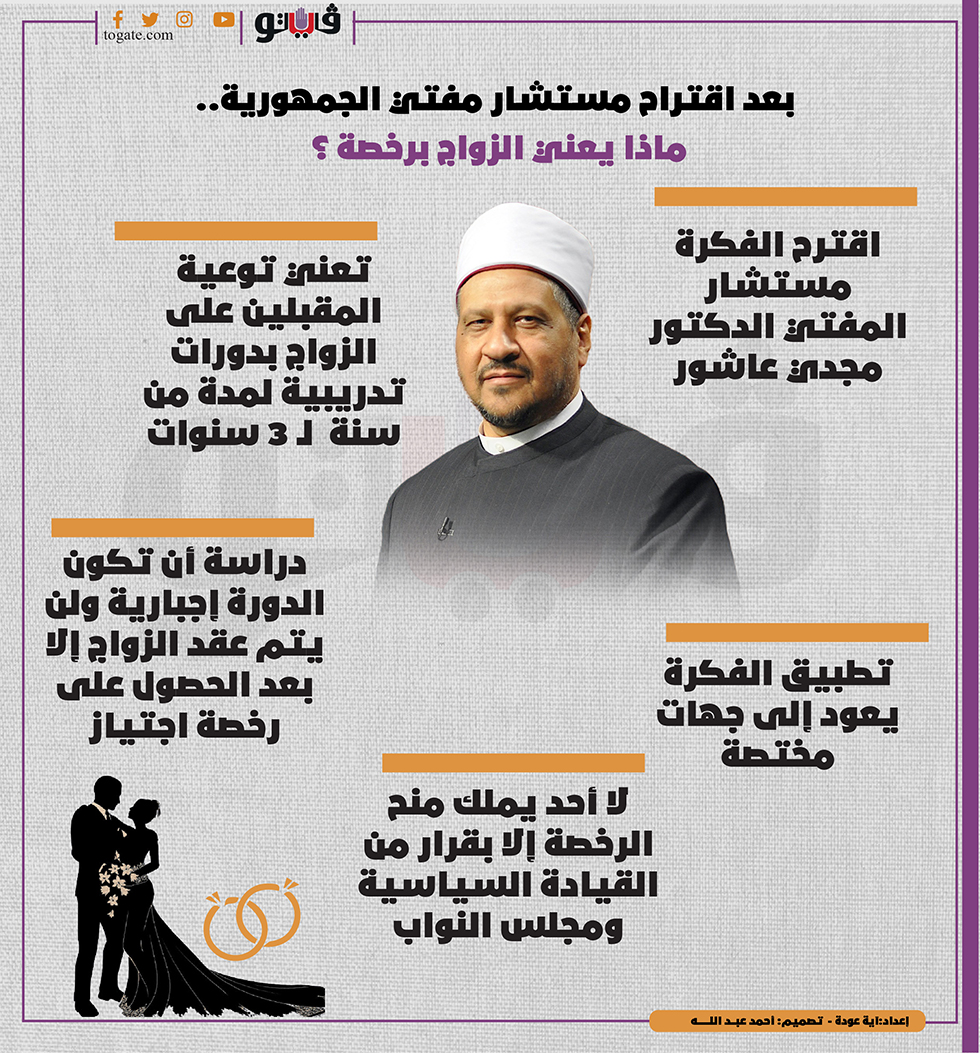 بعد اقتراح مستشار مفتي الجمهورية.. ماذا يعني الزواج برخصة ؟ | انفو جراف الأحد 31/أكتوبر/2021 - 08:03 م 10/31/2021 8:03:37 PM ماهية الزواج برخصة آية عودة شارك طباعة 18 حجم الخط شارك طباعة الزواج برخصة اقتراح الزواج برخصة تقليل نسب الطلاق أسباب الطلاق أسباب الطلاق في مصر
