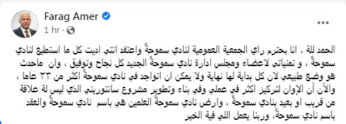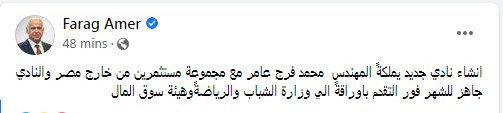 وكتب فرج عامر تدوينة على الفيس بوك "إنشاء نادي جديد يملكه المهندس محمد فرج عامر مع مجموعة مستثمرين من خارج مصر والنادي جاهز للشهر فور التقدم بأوراقه إلى وزارة الشباب والرياضة وهيئة سوق المال".