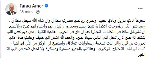 وكتب فرج عامر تدوينة على الفيس بوك قال فيها: "سموحة نادي عريق ونادي عظيم، وصرح رياضي مصري عملاق وإن شاء الله سيظل عملاق، وسيزدهر أكثر وطموحات أعضائه شيء جميل ومحترم، واكيد رأيهم واختياراتهم صح ".