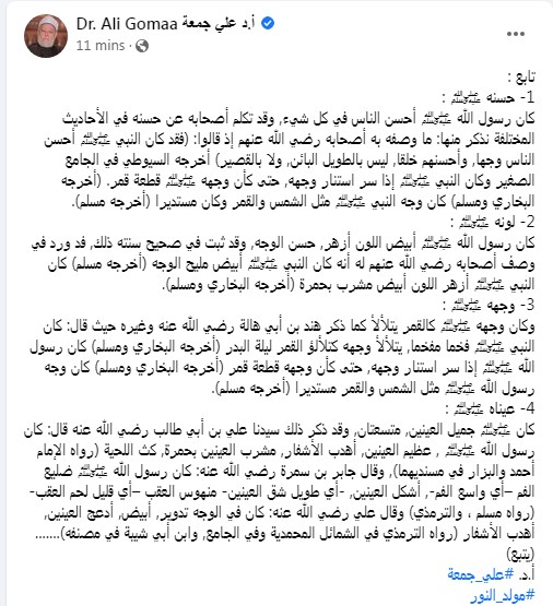 وكتب علي جمعة تدوينة على الفيس بوك "1- حسنه ﷺ: كان رسول الله ﷺ أحسن الناس في كل شيء، وقد تكلم أصحابه عن حسنه في الأحاديث المختلفة نذكر منها: ما وصفه به أصحابه رضي الله عنهم إذ قالوا: (فقد كان النبي ﷺ أحسن الناس وجها، وأحسنهم خلقا، ليس بالطويل البائن، ولا بالقصير) أخرجه السيوطي في الجامع الصغير وكان النبي ﷺ إذا سر استنار وجهه، حتى كأن وجهه ﷺ قطعة قمر. (أخرجه البخاري ومسلم) كان وجه النبي ﷺ مثل الشمس والقمر وكان مستديرا (أخرجه مسلم).