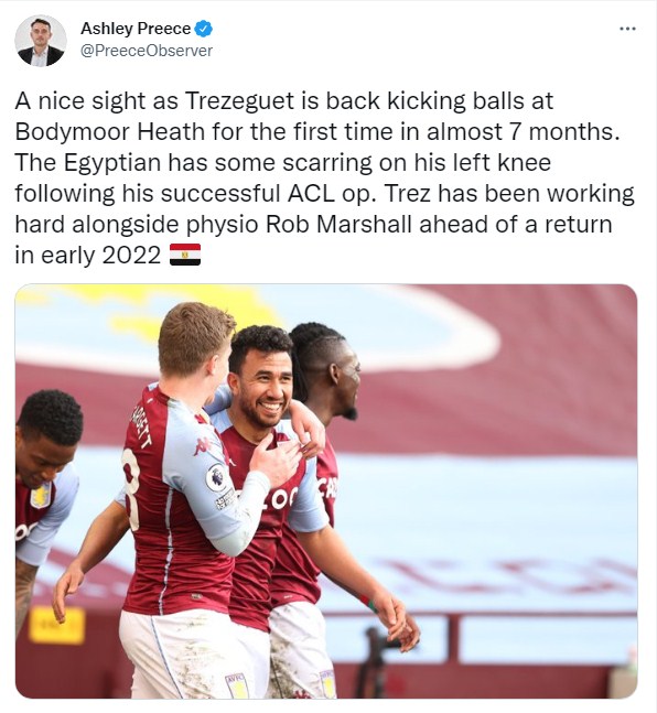 وكتب مراسل برمنجهام ميل آشلي برايس تغريدة على تويتر قال فيها "مشهد جميل مع عودة تريزيجيه لركل الكرات في ملعب آستون فيلا بدي مور هيلث لأول مرة منذ حوالي 7 أشهر. المصري لديه بعض الإصابات في ركبته اليسرى بعد نجاحه في عملية رباط صليبي في الركبة. كان تريزيجيه يعمل بجد إلى جانب الطبيب الفيزيائي روب مارشال قبل العودة في أوائل عام 2022"