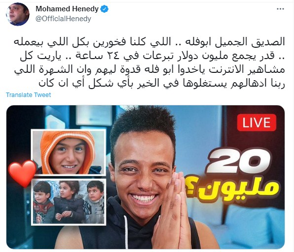 وقال الفنان محمد هنيدي "الصديق الجميل ابوفله.. اللي كلنا فخورين بكل اللي بيعمله.. قدر يجمع مليون دولار تبرعات في ٢٤ ساعة.. ياريت كل مشاهير الإنترنت ياخدوا ابو فله قدوة ليهم وان الشهرة اللي ربنا ادهالهم يستغلوها في الخير بأي شكل أي ان كان".