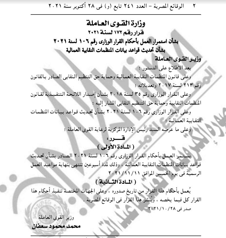وجاء في نص القرار: يستمر العمل بأحكام القرار الوزاري رقم 106 لسنة 2021 الصادر بشأن تحديث قواعد بيانات المنظمات النقابية العمالية وذلك لمدة أسبوعين تنتهي بنهاية مواعيد العمل الرسمية في يوم الخميس الموافق 11/11/2021.