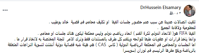 وكتب السمري على صفحته بالفيس بوك: تلقيت اتصالات عديدة عن سبب عدم حضور جلسات الفيفا أو تكليف محام في قضية خالد بوطيب.