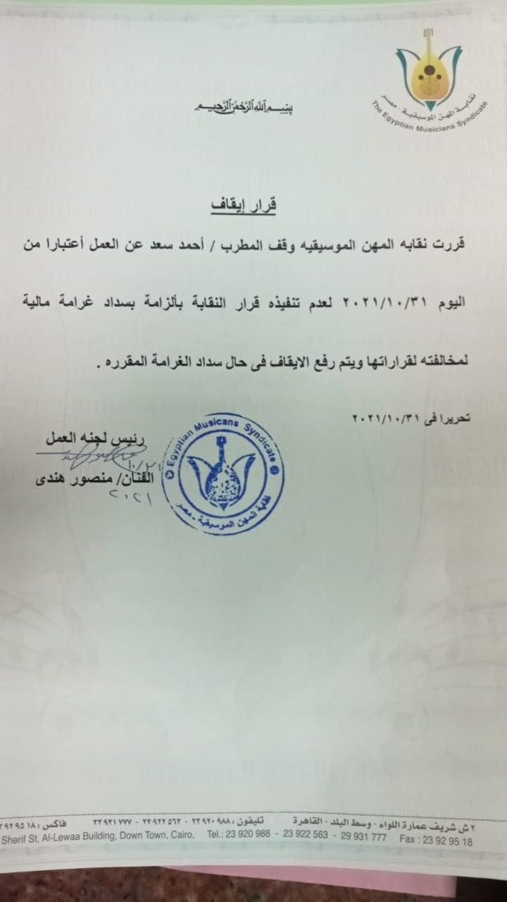 وجاء في بيان صادر عن النقابة: "وقف قرار الإيقاف للمطرب أحمد سعد، حيث صدر قرار إيقاف للمطرب أحمد سعد على خلفية قيامه بحفل في الساحل الشمالي مخالفًا قرار النقابة بعدم الالتزام بعدد العازفين، وكانت النقابة قد غرمته مبلغ عشرون ألف جنيه ولم يتم سداد مبلغ الغرامة حتى صدور قرار الإيقاف اليوم ٢٠٢١/١٠/٣١".