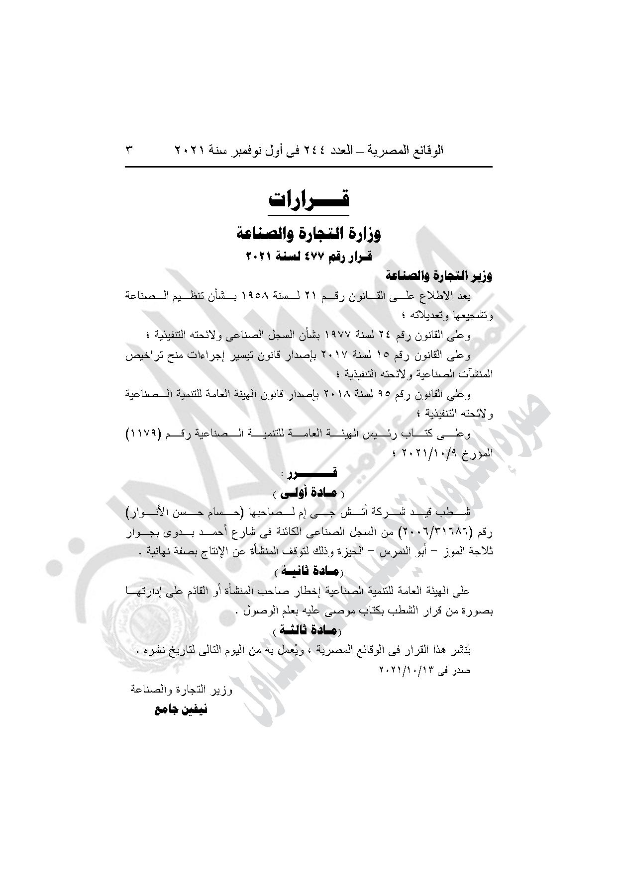 القرار رقم 477 لسنة 2021، بشأن شطب قيد شركة أتش جي إم لصاحبها (حسان حسن الأنوار) من السجل الصناعي الكائن في شارع أحمد بدوي بجوار ثلاجة الموز بأبو النمرس في محافظة الجيزة، لتوقف المنشأة عن الإنتاج بصفة نهائية.