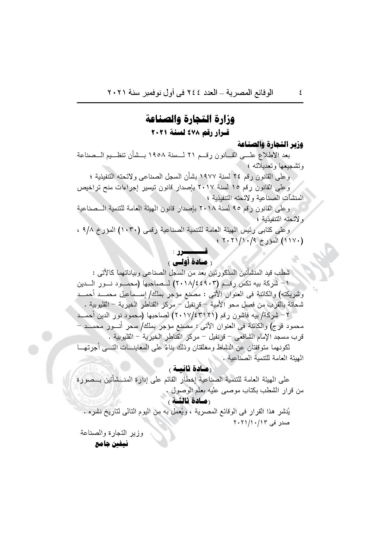 والقرار رقم 478 لسنة 2021، بشأن شطب المنشأتين (شركة بيه تكس لصاحبها نور الدين وشريكته، والكائنة في مصنع مؤجر ملك إسماعيل محمد أحمد شحاته بالقرب من فصل محو الأمية قرنفل، بمركز القناطر الخيرية بالقليوبية)، و(شركة بيه فاشون لصاحبها محمود نور الدين أحمد محمود فرج والكائنة بمصنع مؤجر ملك سحر أنور محمد قرب مسجد الإمام الشافعي، قرنفيل مركز القناطر، القليوبية)، لكونهما متوقفتان عن النشاط ومغلقتان، وذلك بناءً على المعاينات التي أجرتها الهيئة العامة للتنمية الصناعية.
