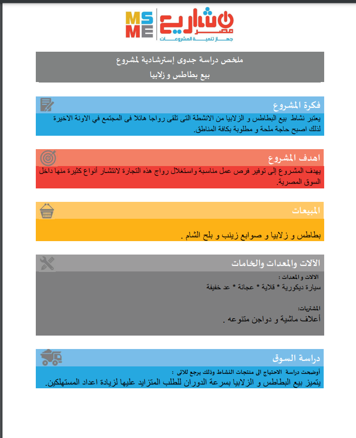 و"مشروع بيع بطاطس وزلابيا" يعتبر أحد المشروعات الهامة التى تهدف إلى توفير فرص عمل مناسبة حيث انتشر هذا المشروع بصور وأنواع كثيرة منها داخل السوق المصرية، ويقدم جهاز تنمية المشروعات الصغيرة والمتوسطة دراسة جدوى لهذا المشروع مجانا والتي سوف نتعرف عليها من خلال السطور التالية.