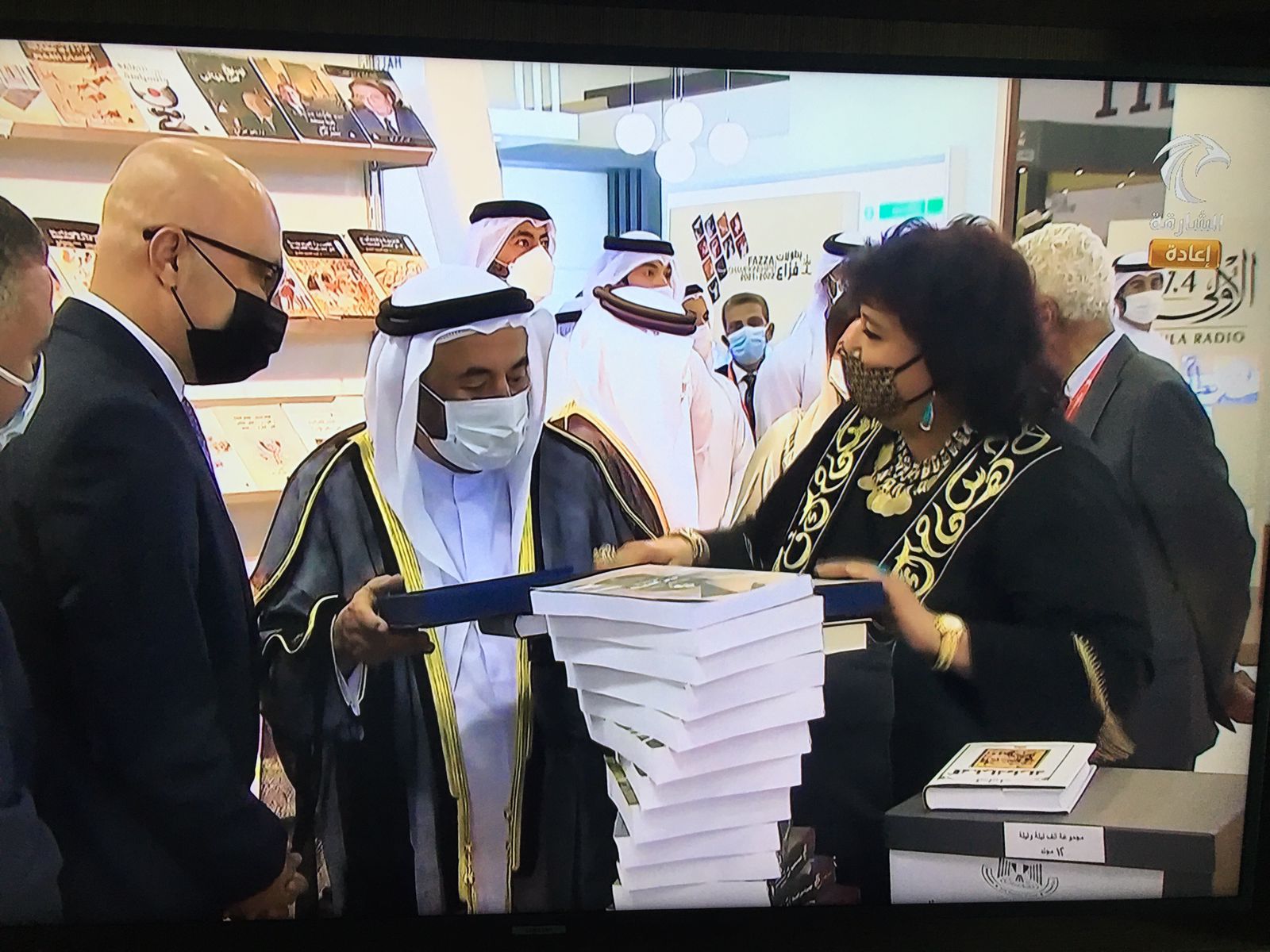وخلال الافتتاح تفقدت وزيرة الثقافة وحاكم الشارقة جناحي الهيئة المصرية العامة للكتاب ودار الكتب والوثائق القومية المشاركين فى هذه الدورة كممثلين لوزارة الثقافة وأهدته نسخة خاصة من موسوعة مصر القديمة لسليم حسن، واخرى من ألف ليلة وليلة طبعة دار الكتب والوثائق القومية، إضافة إلى الإصدار الوثائقي من كتاب مشاركات مصر الدولية في الاكسبو منذ تأسيسه والذي يعرض حاليا بإكسبو دبي كما اطلعته على أحدث إصدارات الهيئة العامة للكتاب والمشاريع المستقبلية التي تسهم بها وزارة الثقافة المصرية في تعزيز الهوية وبناء الوعي، حيث أقيم جناح هيئة الكتاب على مساحة 36 مترا ويضم أحدث إصدارتها مثل موسوعة المضللون لمحمد الباز، موسوعة الحضارة الفرعونية للنشء، أحدث إصدارات سلسلتى ما ورؤية بالإضافة إلى العديد من العناوين الفكرية والإبداعية التي تصدرها الهيئة.