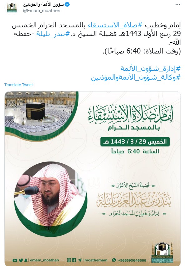 وكتبت وكالة شؤون الأئمة والمؤذنين تغريدة عبر حسابها الرسمي بتويتر قالت: "إمام وخطيب #صلاة_الاستسقاء بالمسجد الحرام الخميس 29 ربيع الأول 1443هـ فضيلة الشيخ د.#بندر_بليلة -حفظه الله-. (وقت الصلاة: 6:40 صباحًا).
