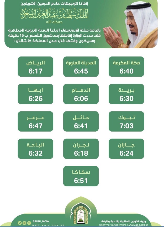 ونشر الحساب الرسمي لوزارة الشؤون الإسلامية عبر حسابها الرسمي على تويتر بيان يوضح مواعيد الصلاة في مدن المملكة؛ كما حددت وزارة الشؤون الإسلامية والدعوة والإرشاد لإقامة صلاة الاستسقاء بمساجد المملكة 15 دقيقة بعد شروق الشمس، بناء على دعوة خادم الحرمين الشريفين.