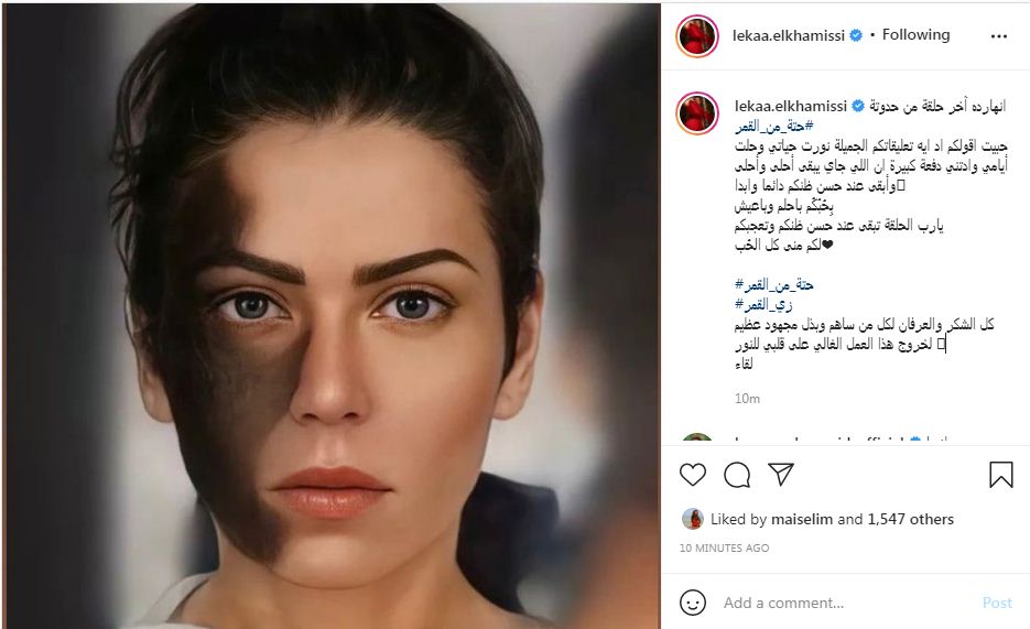 ونشرت لقاء الخميسي صورة من شخصيتها التي تجسدها بالمسلسل معلقة عليها قائلة: "#حتة_من_القمر.. حبيت اقولكم اد ايه تعليقاتكم الجميلة نورت حياتي وحلت أيامي وادتني دفعة كبيرة ان اللي جاي يبقى أحلى وأحلى وأبقى عند حسن ظنكم دائما وأبدا بحبكم.. يارب الحلقة تبقى عند حسن ظنكم وتعجبكم.. لكم منى كل الحُب".