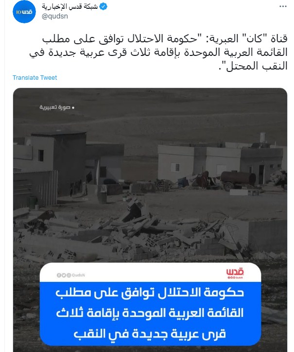 ذكرت شبكة قدس الإخبارية أن "حكومة الاحتلال الإسرائيلية وافقت على مطلب القائمة العربية الموحدة بإقامة ثلاث قرى عربية جديدة في النقب المحتل"، وذلك حسبما ورد في قناة "كان" العبرية.