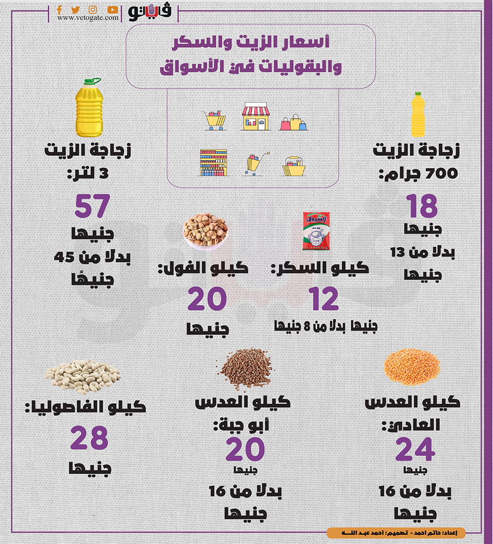 أسعار الزيت والسكر والبقوليات في الأسواق | انفوجراف الأربعاء 03/نوفمبر/2021 - 09:38 م 11/3/2021 9:38:22 PM أسعار البقوليات في الأسواق حاتم أحمد شارك طباعة 18 حجم الخط شهدت أسعار الزيت والسكر والبقوليات، ارتفاعًا كبيرًا في الأسواق خلال الفترة الأخيرة. شارك طباعة زجاجة الزيت سعر كيلو السكر أسعار كيلو الفول العدس العادي