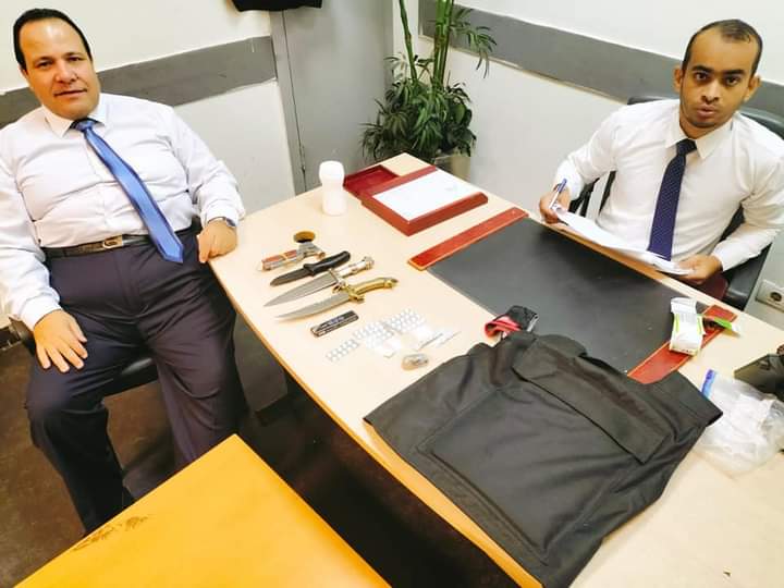 وبالعرض على رضا أبو العزم مدير الجمرك قرَّر تكليف محمد قنديل بتفتيش حقائب الراكب فتبين وجود قطعة حشيش بوزن 18 جرامًا وصديرى واقٍ ضد الرصاص و٤ خناجر و57 قرصًا من الأقراص المخدرة مخبأة بين طيات ملابسه داخل الحقائب.