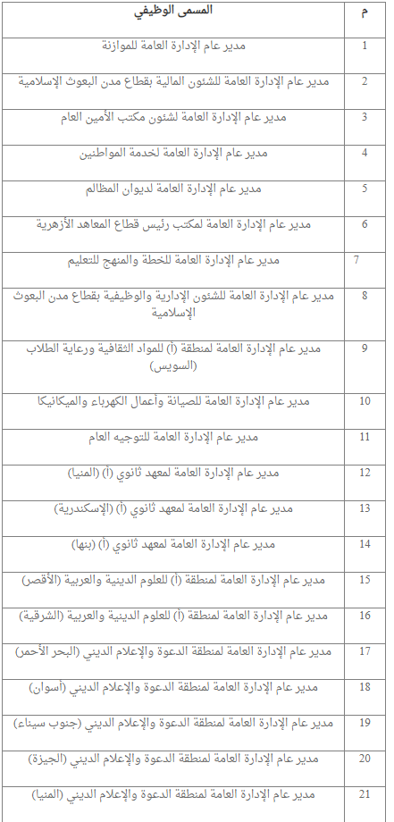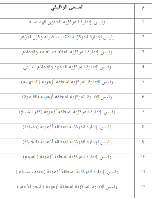 أعلن الأزهر الشريف حاجته لشغل بعض الوظائف القيادية بالمستوى الوظيفي (العالي - مدير عام) ببعض قطاعاته، وَفْقًا لأحكام قانون الخدمة المدنية الصادر بالقانون رقم (81) لسنة 2016 م ولائحته التنفيذية، وقرار الجهاز المركزي للتنظيم والإدارة رقم (35) لسنة 2019 م بشأن معايير توصيف وتقييم الوظائف وبيانها كالتالي: