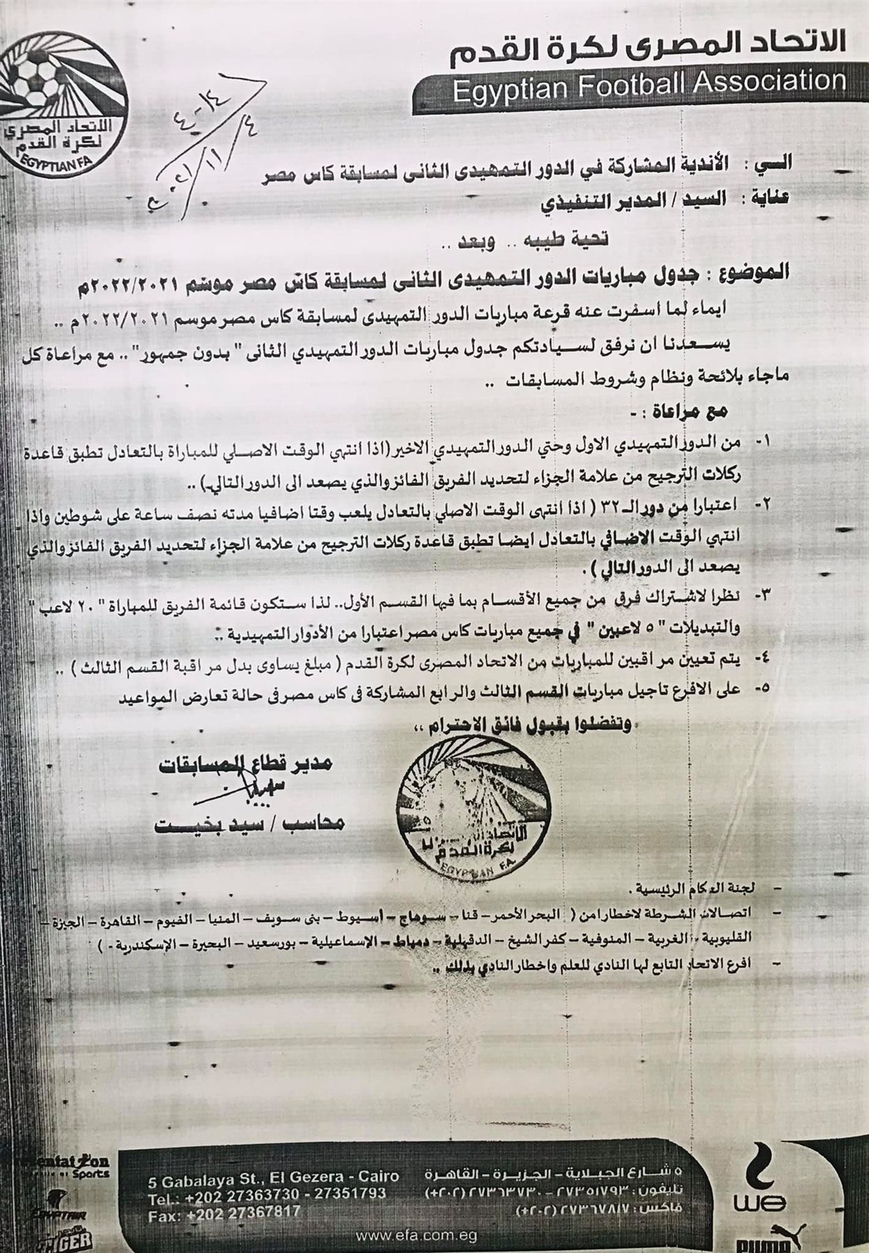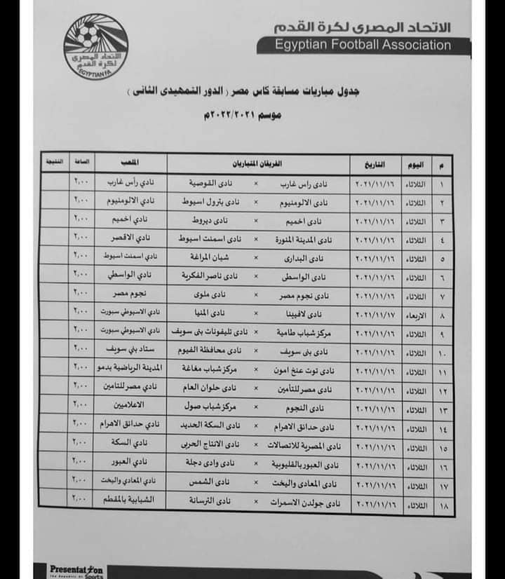 أعلن اتحاد الكرة، جدول مباريات الدور التمهيدي الأول والثاني لمسابقة كأس مصر موسم 2021 - 2022.