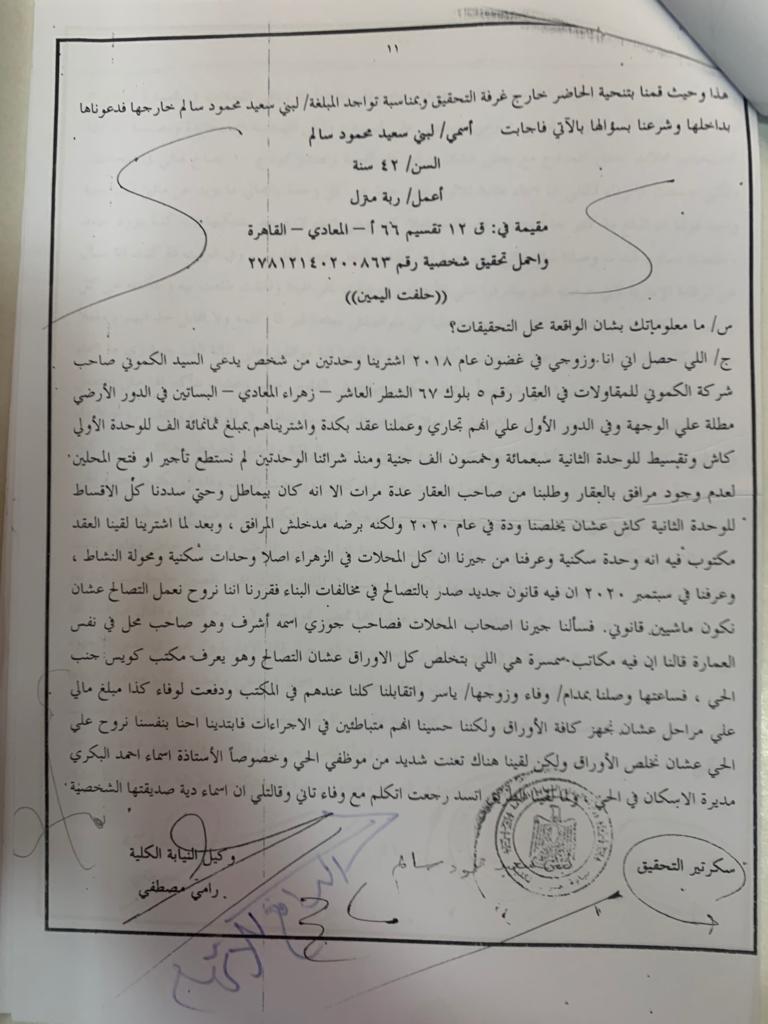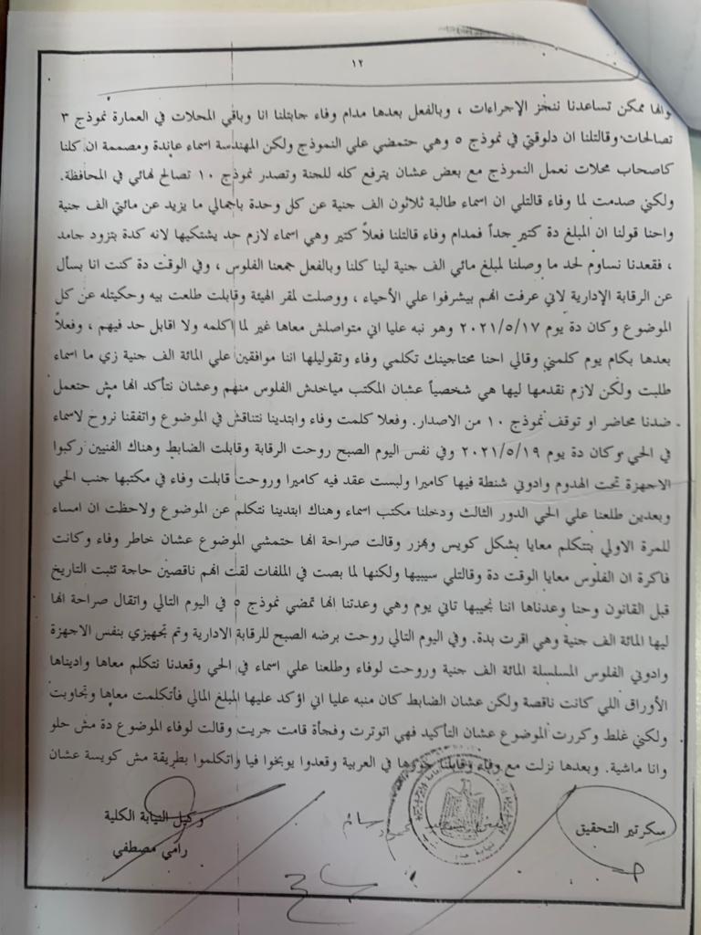 وبعد لما اشترينا لقينا العقد مكتوب فيه انه وحدة سكنية وعرفنا من جيرانا ان كل المحلات في الزهراء اصلا وحدات سكنية ومحول النشاط وعرفنا في سبتمبر 2020 ان فيه قانون جديد صدر بالتصالح في مخالفات البناء فقررنا اننا نروح تعمل التصالح عشان نكون ماشيين قانوني فسألنا جيرانا أصحاب المحلات فصاحب جوزي اسمه اشرف وهو صاحب محل في نفس العمارة قالنا ان فيه مكاتب سمسرة هي اللي بتخلص كل الاوراق علشان التصالح وهو يعرف مكتب كويس جنب الحي، فساعتها وصلنا بمدام وفاء وزوجها ياسر واتقابلنا كلنا عندهم في المكتب ودفعت لوفاء كذا مبلغ مالي على مراحل عشان نجهز كافة الاوراق ولكننا حسينا أنهم متباطئين في الإجراءات فابتدينا احنا بنفسنا نروح على الحي عشان نخلص الأوراق ولكن لقينا هناك تعنت شديد من موظفي الحي وخصوصا الاستاذة أسماء أحمد البكري مديرة الإسكان في الحي.