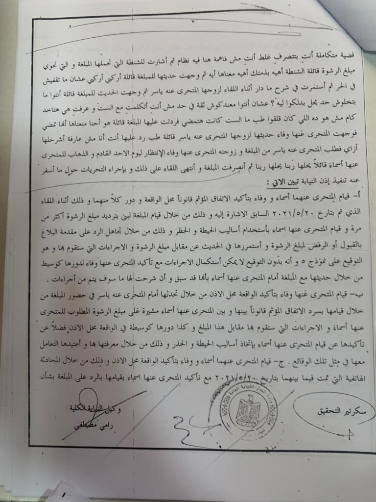 حصلت فيتو على نص أقوال المبلغة عن قضية رشوة حي البساتين والتي تحقق فيها النيابة العامة.