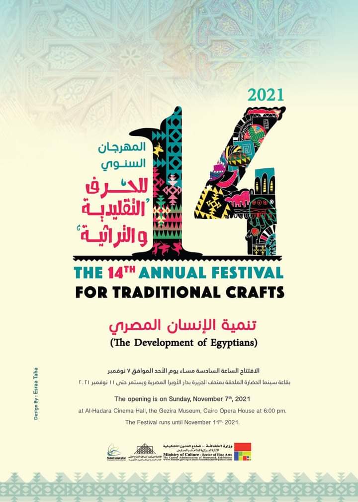 تفتتح الدكتورة إيناس عبدالدايم وزير الثقافة يرافقها الدكتور خالد سرور رئيس قطاع الفنون التشكيلية الدورة الرابعة عشر لمهرجان الحرف التراثية تحت عنوان "تنمية الإنسان المصري" وذلك يوم الأحد 7 نوفمبر 2021 في تمام السادسة مساءً بمركز سينما الجزيرة بساحة الأوبرا.