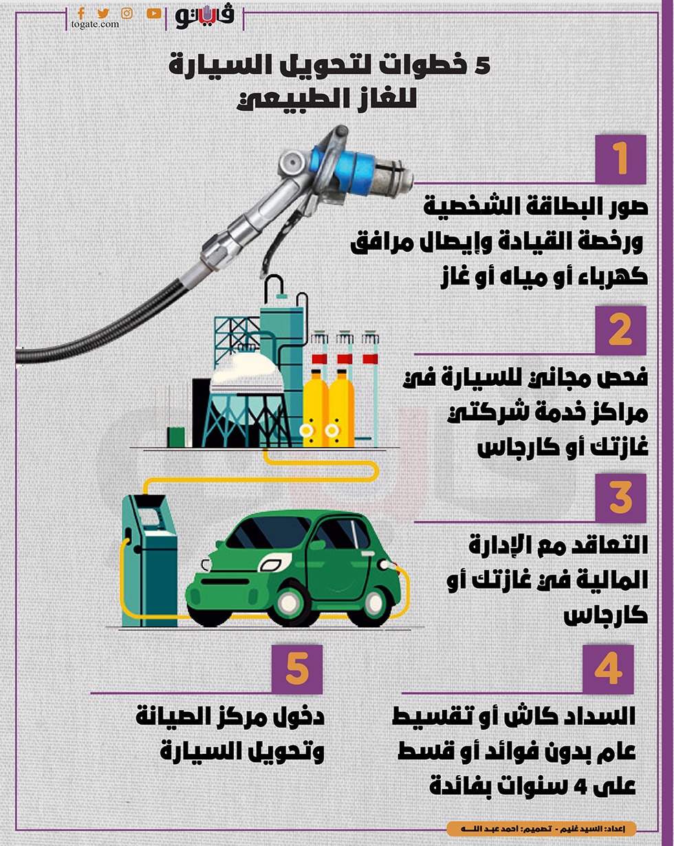 5 خطوات لتحويل السيارة للغاز الطبيعي | إنفوجراف الأحد 07/نوفمبر/2021 - 03:22 م 11/7/2021 3:22:38 PM سيارة صورة ارشيفية السيد غنيم شارك طباعة 18 حجم الخط شارك طباعة تحويل السيارات الغاز الطبيعي تحويل السيارات خطوات تحويل السيارة غازتك كارجاس الغاز الطبيعي