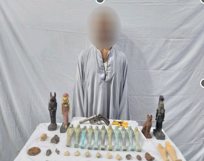 ضبط قطاع الأمن العام، مزارعا بأسيوط لقيامه بالحفر والتنقيب غير المشروع عن الآثار وبحوزته 63 قطعة يشتبه فى أثريتها.