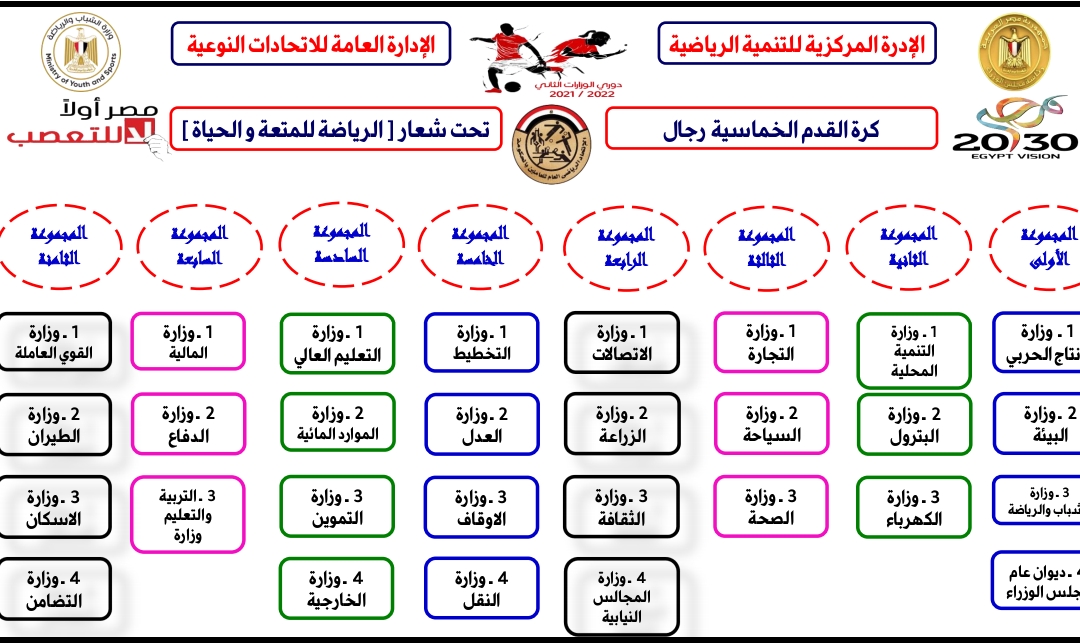 وكانت القرعة قد أسفرت عن وقوع فريق وزارة الشباب والرياضة بالمجموعة الأولى بجانب فرق وزارات" الإنتاج الحربي، البيئة، ديوان عام مجلس الوزراء"، وضمت المجموعة الثانية وزارات" التنمية المحلية، البترول والثروة المعدنية، الكهرباء"، وضمت المجموعة الثالثة وزارات " التجارة والصناعة، الصحة والسكان، السياحة والآثار"، فيما ضمت المجموعة الرابعة وزارات"الاتصالات، الزراعة، الثقافة، شؤون المجالس النيابية".