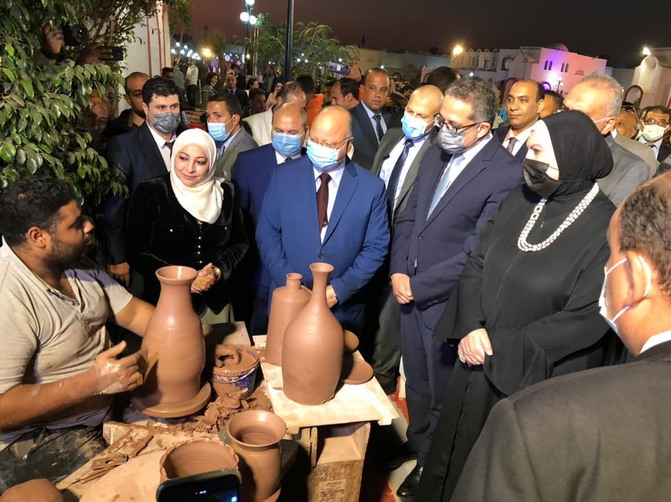 وشاهد الوزراء ومحافظ القاهرة عقب الافتتاح كيفية قيام الحرفيين بعمل المشغولات الخزفية من الفخار كما شاهدو معرضًا للمنتجات الخزفية الذى ضم جناحًا لاطفال مدينة الاسمرات الذين تم تعليمهم حرفة صناعة الفخار.