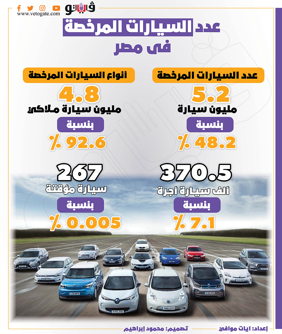 عدد السيارات المرخصة فى مصر|إنفوجراف الثلاثاء 09/نوفمبر/2021 - 12:02 ص 11/9/2021 12:02:41 AM سيارات آيات الموافى شارك طباعة 18 حجم الخط شارك طباعة سيارة السيارات سيارة خاصة ملاكي سيارة أجرة
