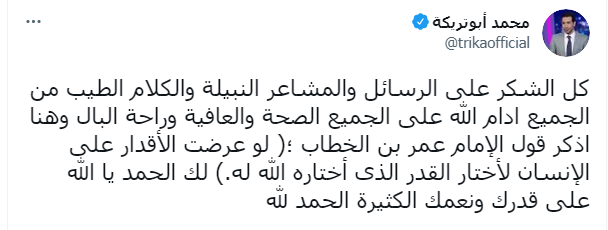 وكتب " أبو تريكة" عبر حسابه الرسمي على موقع التدوينات القصيرة: تويتر": " كل الشكر على الرسائل والمشاعر النبيلة والكلام الطيب من الجميع أدام الله على الجميع الصحة والعافية وراحة البال وهنا أذكر قول الإمام عمر بن الخطاب ؛( لو عرضت الأقدار على الإنسان لأختار القدر الذى أختاره الله له.) لك الحمد يا الله على قدرك ونعمك الكثيرة الحمد لله".