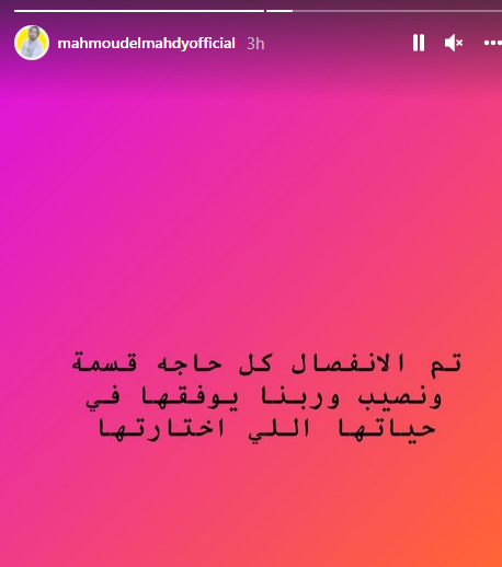 وكتب محمود المهدي عبر خاصية الاستوري بالموقع قائلا: "تم الانفصال كل حاجة قسمة ونصيب وربنا يوفقها في حياتها اللي اختارتها".