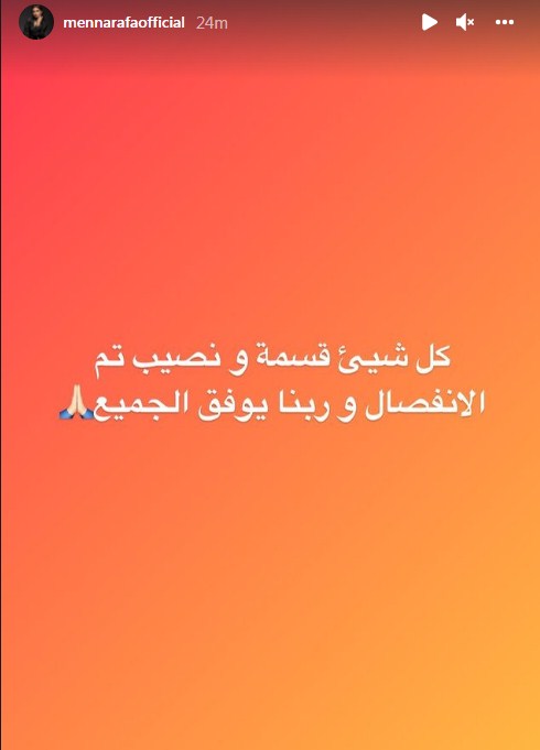وكتبت منة عرفة، عبر خاصية الإستوري على موقع الصور والفيديوهات الشهير " إنستجرام": "كل شيء قسمة ونصيب تم الانفصال وربنا يوفق الجميع".
